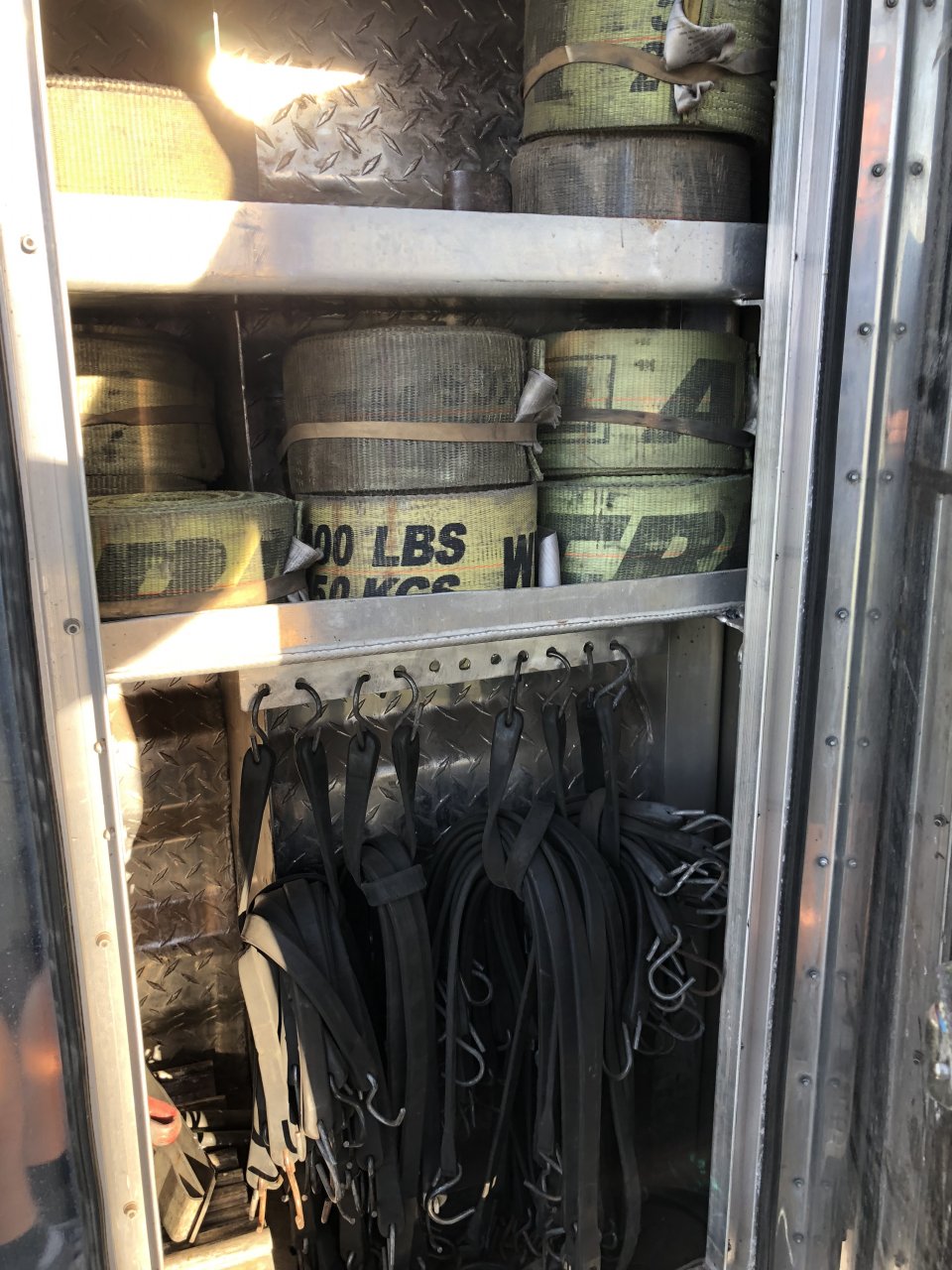 I don’t have a large tool box like that. If I did I would probably have something similar running down one side of the box. I keep 19 30’ straps, one 4” hand ratchet, and one 12’ strap in a 12” step box. That’s all my regular 4” straps and what I need to secure rolled tarps on a double drop without winches. All my 2” straps and longer straps 4” are in the headache rack.