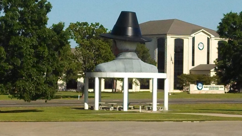 Just for kicks, and in the theme of Pilgrim's Pride, here's a picture of the back of the founder's head in Pittsburg, TX. Not sure if he's shunning the drivers waiting at the dock, or glaring at the traffic going by on 271.