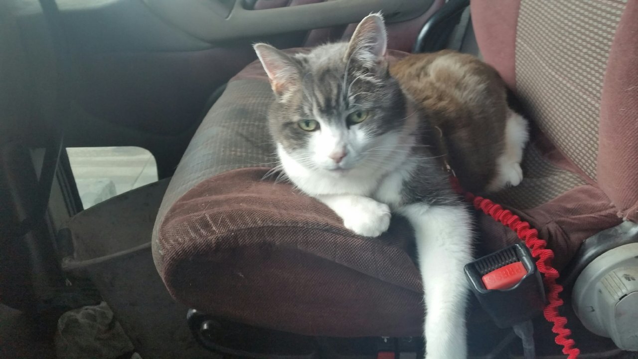 18 year old cat, Screams in the car. Likes the truck. First trip for her was the move North. Second was when I snapped this pic.... Seattle to TX, to NC and a zig zag back.