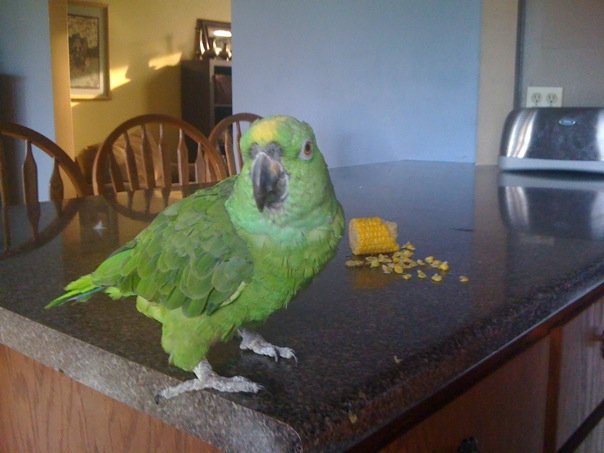 This is Green, our other Yellow Naped Amazon. She is almost 36 years old and has been in my family since being hatched. She hates men, therefore, she only loves me in our immediate family (I have 3 sons and a husband).