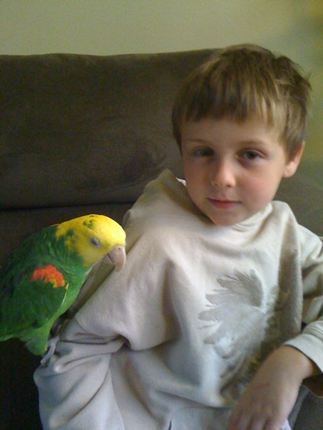 This is Tony, a Double Yellow Headed Amazon. He is my son's bird. He likes us all, but has a fondness for my son. The more rowdy and inappropriate he is with him, the more happy he is. Very strange.