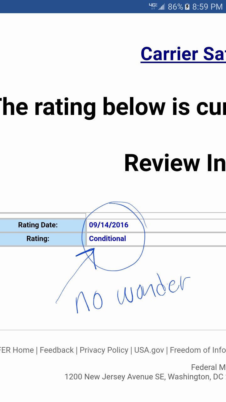 That's the company's safety rating on the FMCSA website, which means they're a stone's throw away from being shut down by the Feds.