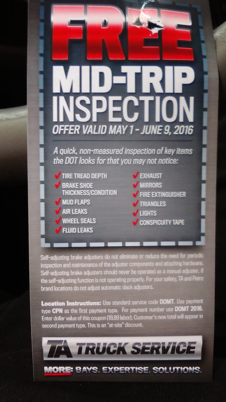 Your an owner operator and know nothing about marketing and sales? They want to find stuff wrong on their "free" mid trip inspection so you'll have it fixed in their shop. This is sales 101 right here. Use fear and free gimmicks to get the customer in the door. The hardest part of brick and mortar business is to get the customer to walk in.