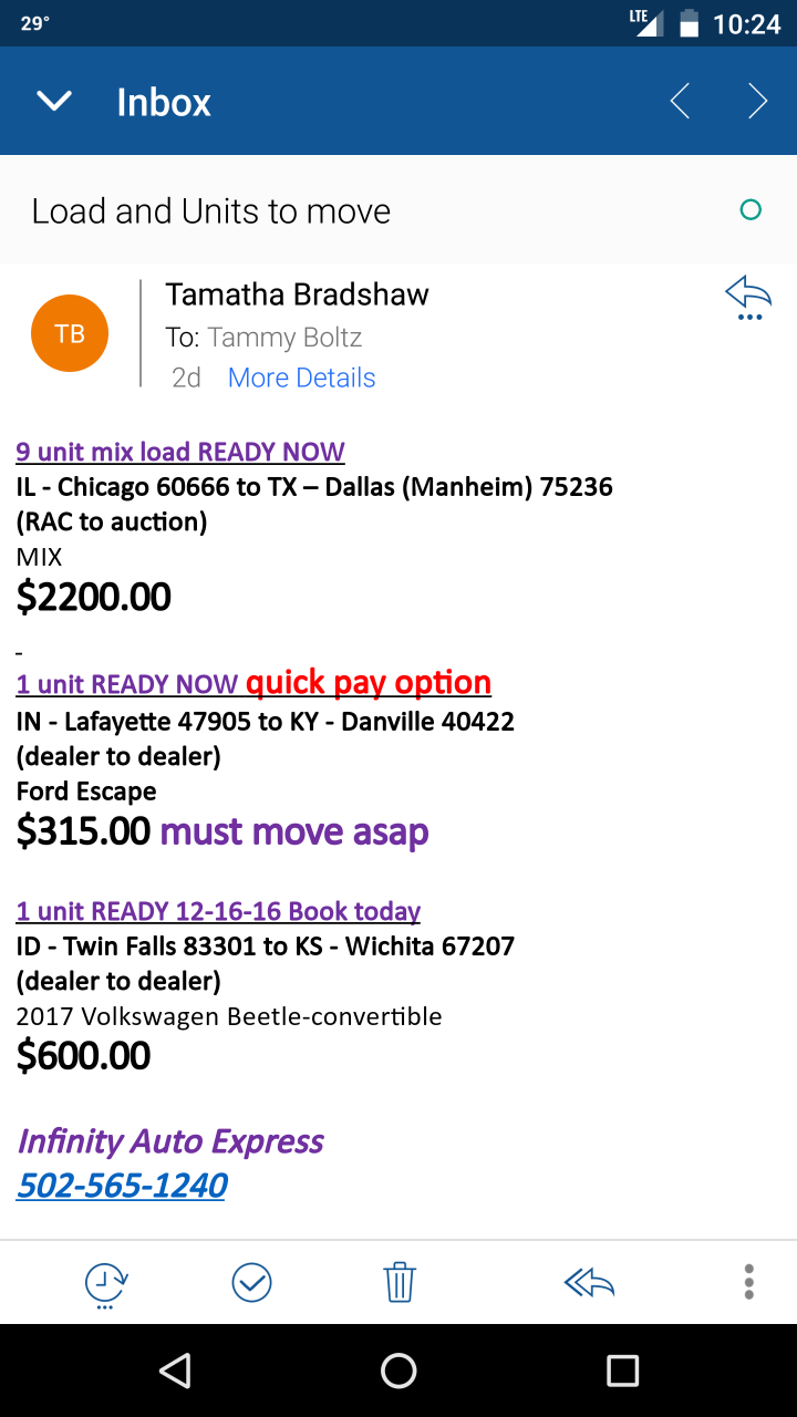 Looks like typical broker ####. The other guy was asking aboug new car rates. Hansen and Adkins and Proficient are looking for some O/O's and company drivers, I would park my truck and drive for them before I hauled auction cars for those rates. You cwnt pay for a 280K car carrier hauling cars for .25 cents per mile.