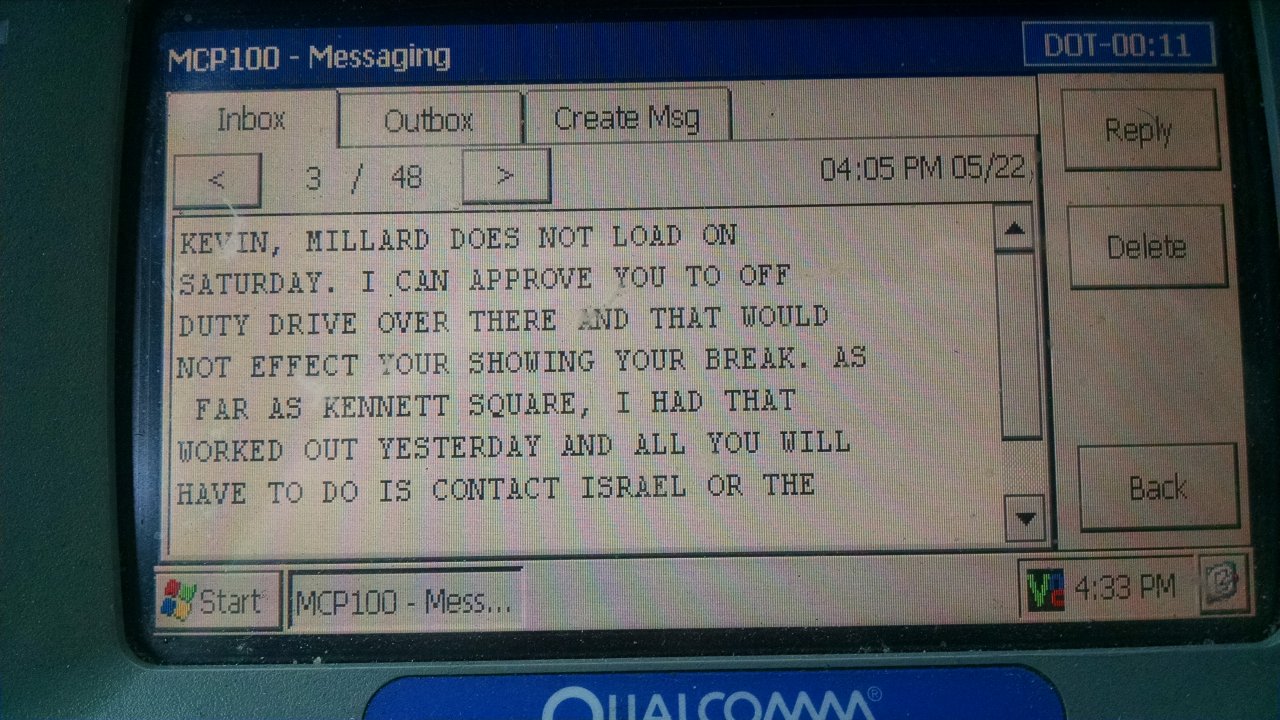 Do not let your company give you any order over the Qualcomm that is illegal. A certain Reefer company lets call them L and C, has dispatchers who tell drivers to line 5 somewhere or to creep over so as not to trigger the Qualcomm. Take photos of anytime they do that and save it. You might need it later.terryg247 Thanks this. -