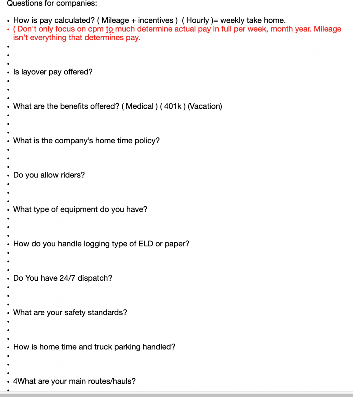 Should ask about area of operations, withholding pay, in -cab cameras, truck speed, unmentioned deductions, detention and layover pay, insurance, miles per week, reimbursement for travel/motel, sign-on bonus, and remember, if they pay by percentage, you may be deadheading for free on every pickup.Another Canadian driver Thanks this.