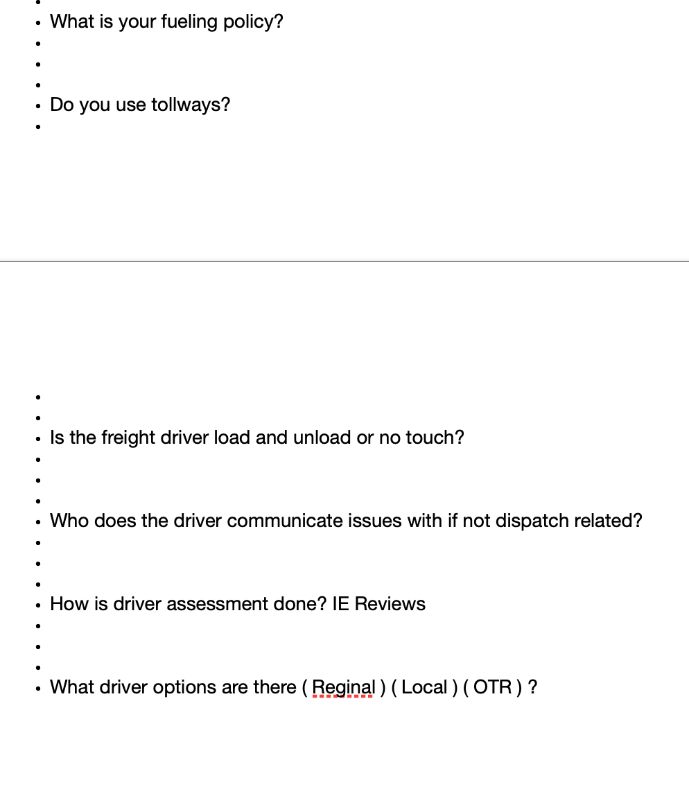 - 5. Are there any bonuses for safety, fuel, sign-on, performance, driver referral, etc.?