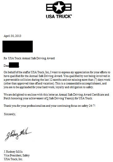 I do all of the things I claim to do while other drivers are around and the following is a pic of a letter I received from the safety department in regards to my actions. This is what they had to say.