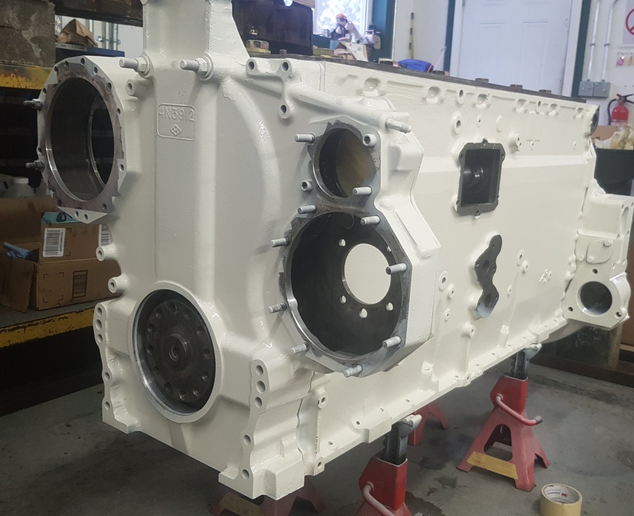 No updates doesn't neccessarily mean no progress. Block, crank and cam checked out. Most all bottom end parts are on order. Crank has never been ground, main bores never machined and the bore is still aligned. Hot tanked/crack checked. Couple thou shaved off the deck to clean up some minor pitting. New frost plugs in the block, all 6 liner seal bores cut/sleeved. New cam bearings installed. Dressed up in CAT Power Module White. 20191020_122745.jpg