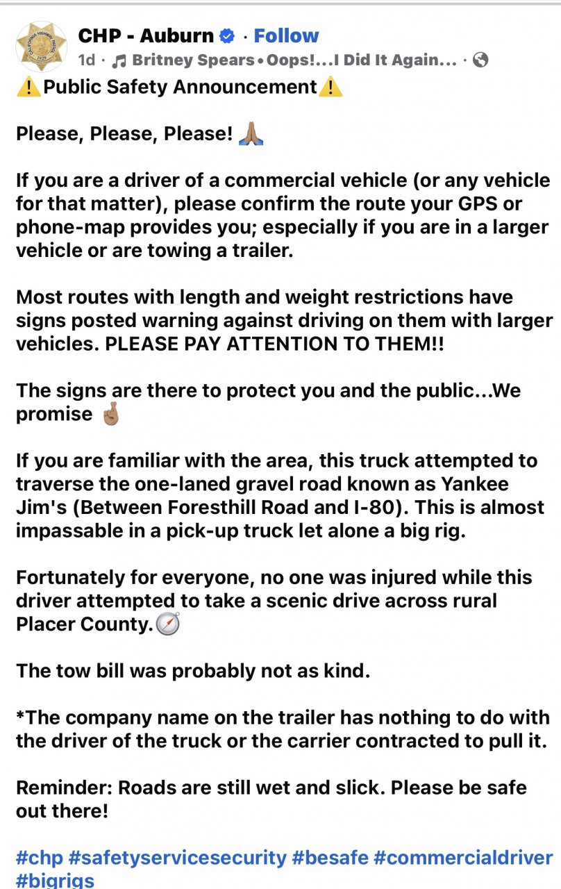 Instead -- the driver in question here very likely used Google Maps, Waze...or similar...probably hoping to save time &/or distance...in lieu of longer truck-rated & legal roads.
