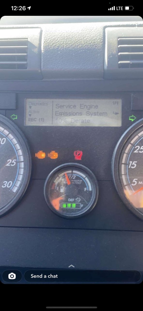 ”service engine emissions system 10% derate” i will also post a picture of it so i try doing a park regen it wont do a park regen 1 of my buddies told me to to turn off the power kill switch for a couple mins then turn it back on after doing that the check engine light went away but the MIL still stayed on with the same msg after driving back to the yard the MIL stayed on but the derate msg went away so did it regen while i was driving back to the yard? Or i should get it checked out? The MIL is on but 0 codes now the truck is a 2016 freightliner cascadia dd13 please advise thank you