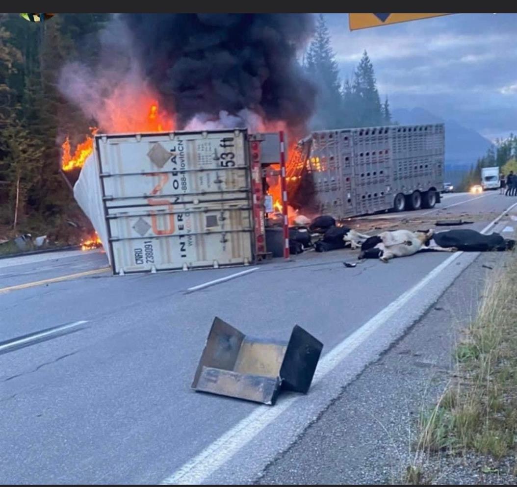 The wreck between Golden and Field, BC yesterday morning was a horrific one. 3 drivers killed, and a truck load of cattle perished too.