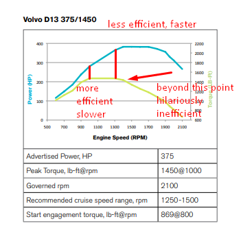 Yep you are getting it. Also there is a formula that you need to understand for how much Torque is needed per LBS you are driving to really maximize the way to use the charts. Once you understand what weights you are gonna pull you can bring it all together for the best MPG's. If you have Facebook or X account I would follow Joel Morrow. He is a Volvo guy and helps spec's equipment and runs unbelievable MPG's in his set ups. Henery Albert is the guy to follow on Freightliner stuff. I do not know anyone that is big on Kenworth stuff for MPG's. I am a Volvo guy and can answer a lot of questions about them if you need some help on that stuff.RushmoreTrucker Thanks this.