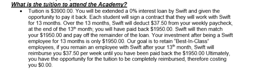 Swift.PNG I'm hoping I can successfully attach a screenshot of part of the Swift document I received when I contacted them out of curiosity. Note the 'each student will sign a contract that they will work for Swift for 13 months' comment.