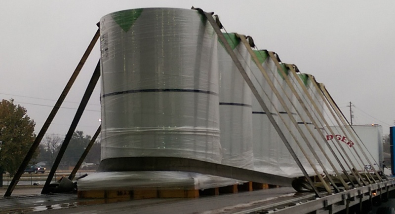 Also, a load we frequently get is a couple 22k+ eye to the sky coils out of Logan in Russellville, KY. The paperwork they will give you and the information the lady at the desk will give you is to criss-cross three straps over them. Based on the weight grades of our four inch straps, three straps will not make you legal on them. You need to throw five.