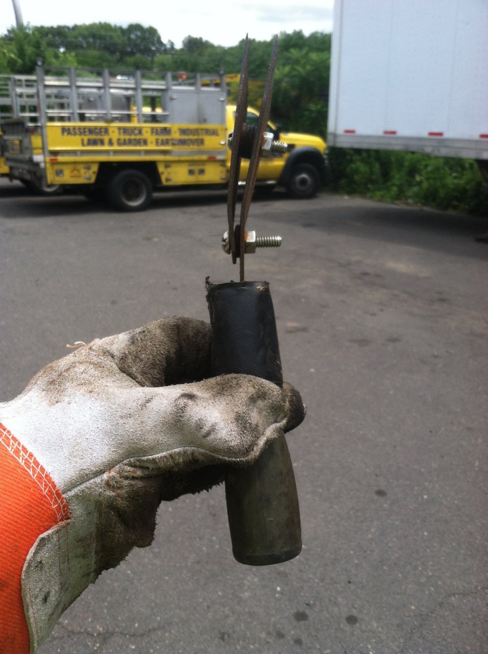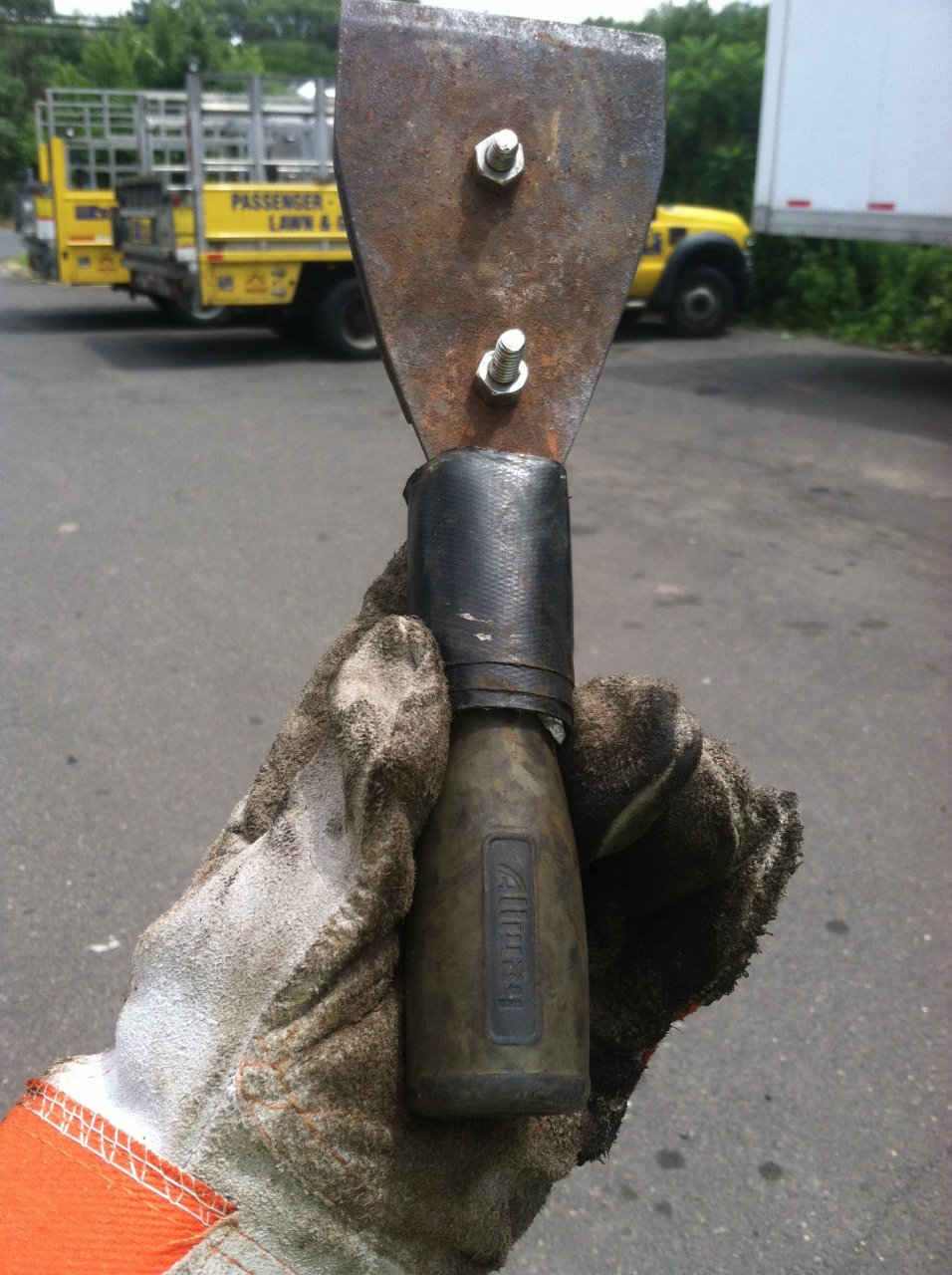 This setup screws onto an extendable painters pole 6'-10' maybe. Can set edge protectors in between the blades Bottom screw I hung out the same length, can use it to hook and pull back straps over a high load, edge protectors that slip a touch too high up and over. Or to rip tags from up high on blind shipments. Took two scrapers, hammered the end off one n cut it. Punched 2 holes with a drill. Put 2 bolts thru, with washers between top one to gap it right. Voila Also I ripped off the base on handle end of the painters pole and put a steel plumbers fitting on it with epoxy-use it to hook chain ends and push them thru longer expanses of where chains go. It's just like a open end rounded nut with a lip on the inside. Works out purty good