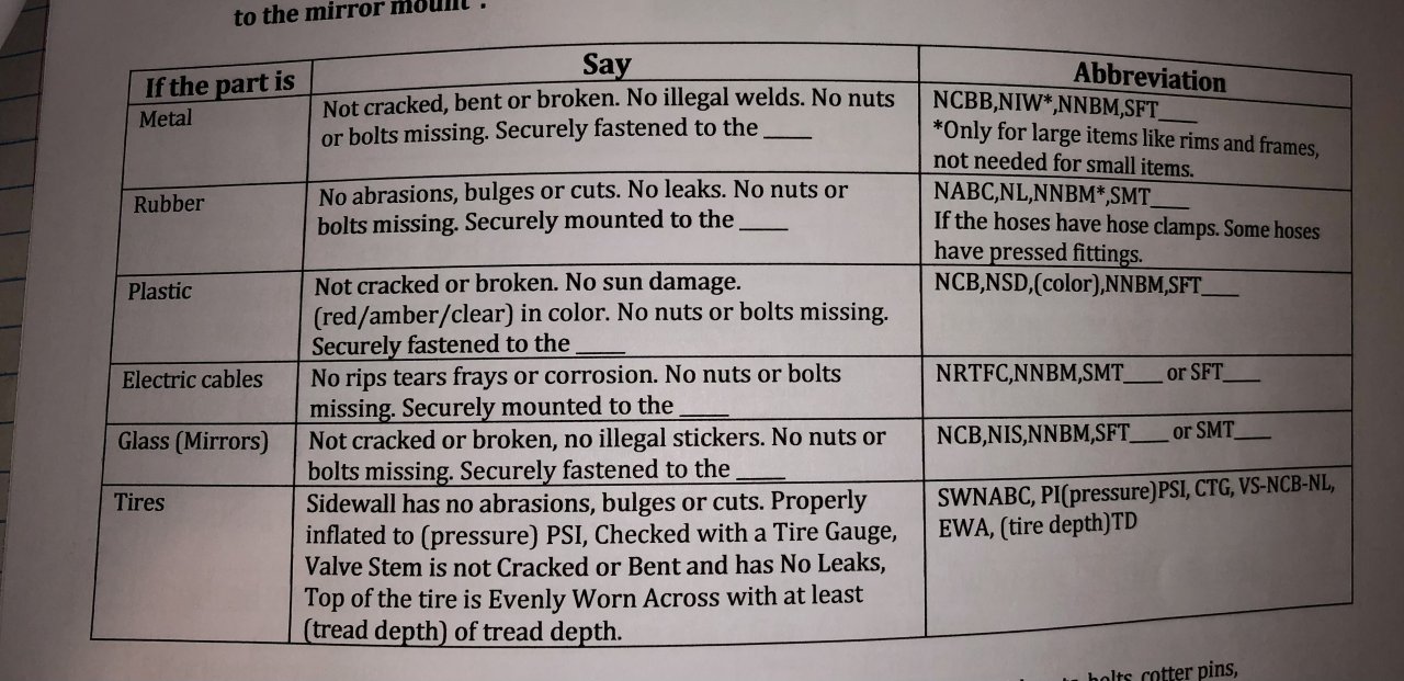 PMS - properly mounted and secured. NCBB - Not cracked bent or broken. ICD for inflation, condition and depth on tires. BEAR for belts, exhaust, alternator and radiator. ABCDF for abrasions, bubbles, cuts, dryrot and frays for rubber parts. There’s also all these abbreviations