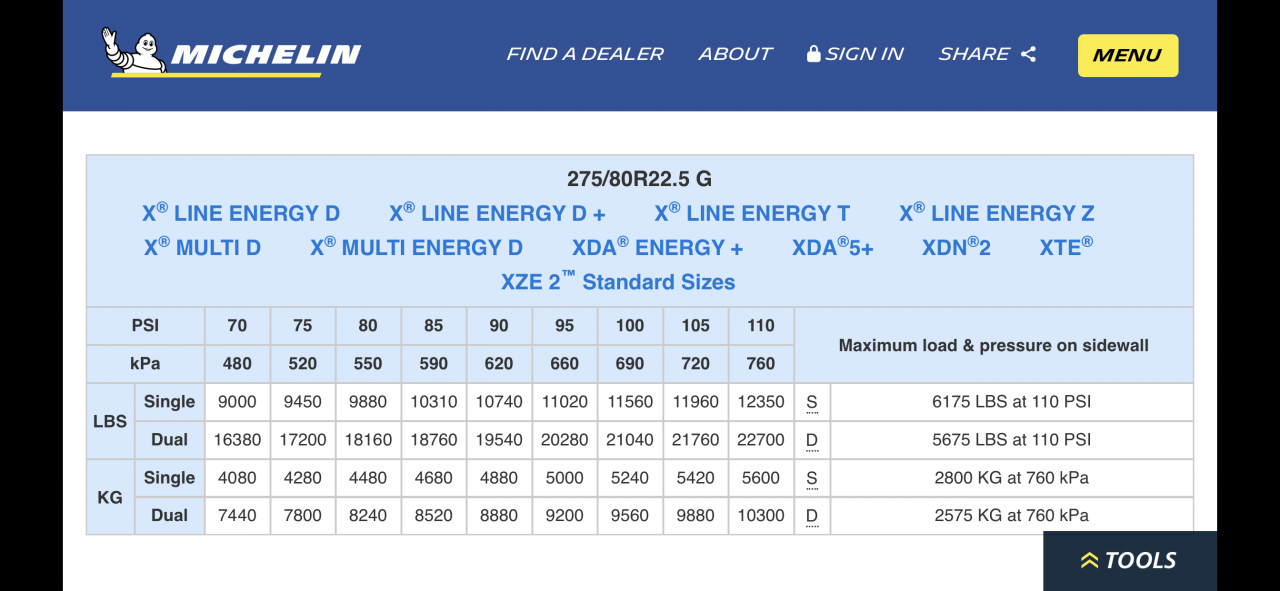 Maybe different kind of question, but what should the tire pressure/ load rating be in correlation to the weight of front end of the truck? If my front end weighs 12,100 lbs and with those G rated tires (which i previously had) at their limits its load capacity is 12,350 lbs @ 105psi.. that is not leaving much of a margin and basically having the tire maxed out all the time. How many pound capacity over your actual weight is ideal? I just put Michelin H rated tires on front 110psi = 12,640lbs, 115psi = 12,930lbs, and 120psi = 13,220lbs....