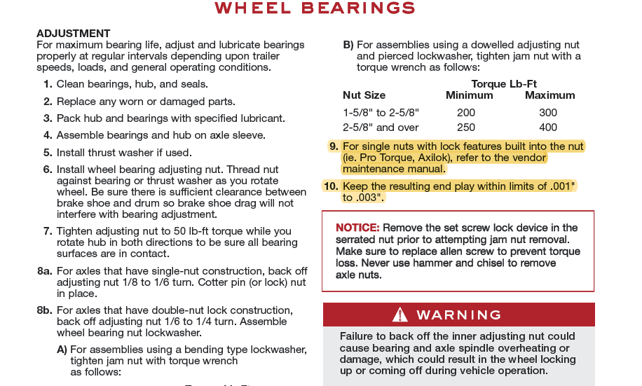 I just wanted to contribute to the topic of bearing adjustments. I replaced all 6 of my wheel hubs. I used stemco one piece protorq nut. Now new hub said to tighten the single nut to very high torque and leave it. protorq obviously said to back off. Well, between competing directions I went with protorq and boy was I wrong. So following hub directions, if you tighten all the way, the wheel does not spin freely. For some reason that goes away once you drive a little bit and its fine. But if you back it off, there is 80% chance the inner seal will leak! I had to re-tighten 4 of 6 hubs on the road, sometimes on the side of the road because almost all of them leaked. With one, I had to replace the inner seal because tightening it after the leak didnt stop the leak. So my advice: if the hub instructions call for max torque and no back off, do that. Drive 50-100 miles and see if the wheel spins freely. Do not back off!