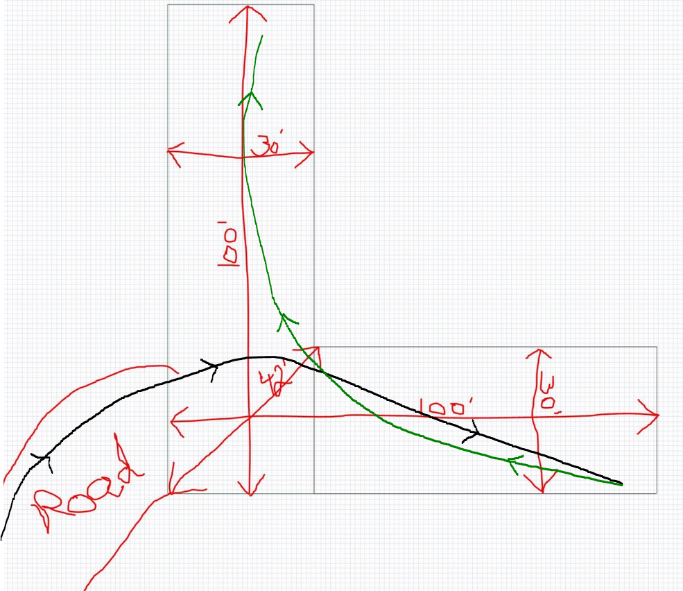 Very helpful, thanks so much! I'm not a truck driver. I actually bought land and I'm trying to design (and figure out) the biggest size trucks that can make it in and out safely for construction, deliveries, etc. So if I want to be safe with nothing touching the house (see new picture), then a 48' trailer should have no problem going in and out? If you could also give me your opinion on how big the diagonal blue line needs to be so I know how wide to make the road going into the elevated building pad. Finally, the road to the house will have a 20% incline - is that OK?