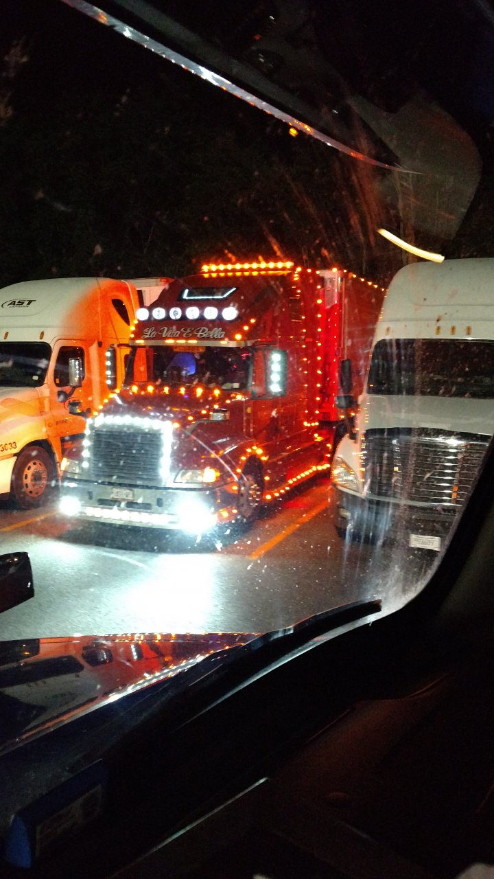 Every square inch of the exterior sleeper, hood and roof was covered in little chrome mudflap girl emblems, must've been over 300 of them.