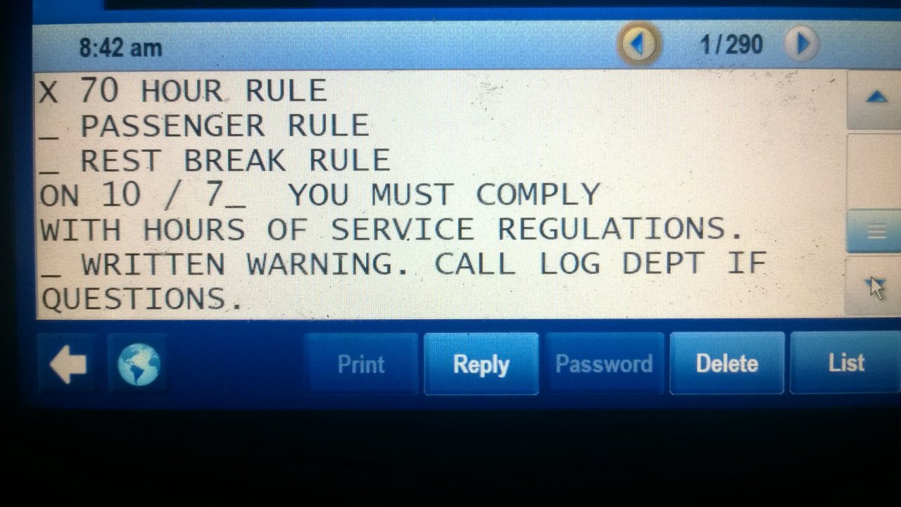 I got called into Safety and my dispatcher actually said I was free to avoid breaking the law, but would be written up for complying with it. AND HE SAID THIS ON THE LINE WITH A SAFETY SPECIALIST LISTENING. He also brought up a topic, then said he didnt know what topic we were discussing when I began to respond.