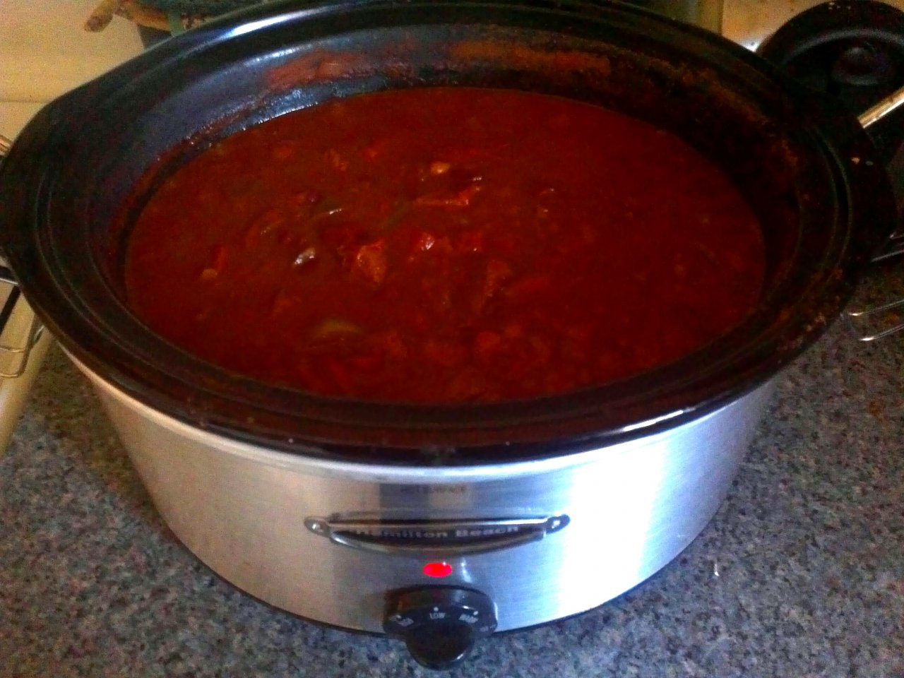 Start with onions, garlic and chilies. Slow cook. After 5 or 6 hours, brown meat, add to chili, add spices, slow cook for another 5 or 6 hours.