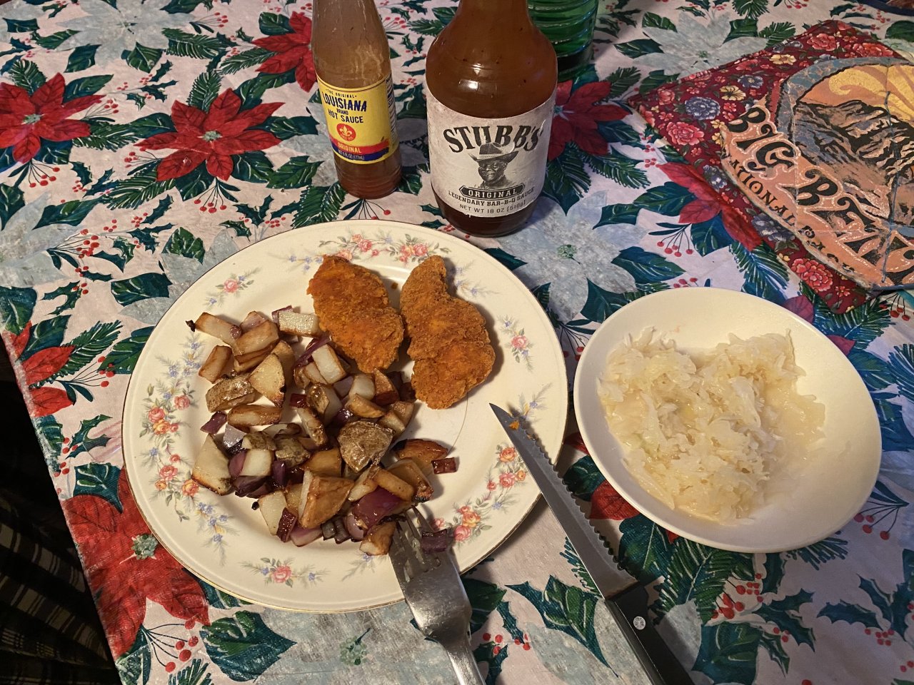 Spicy chicken strips. Fried taters with red onions and fresh garlic. Sauerkraut