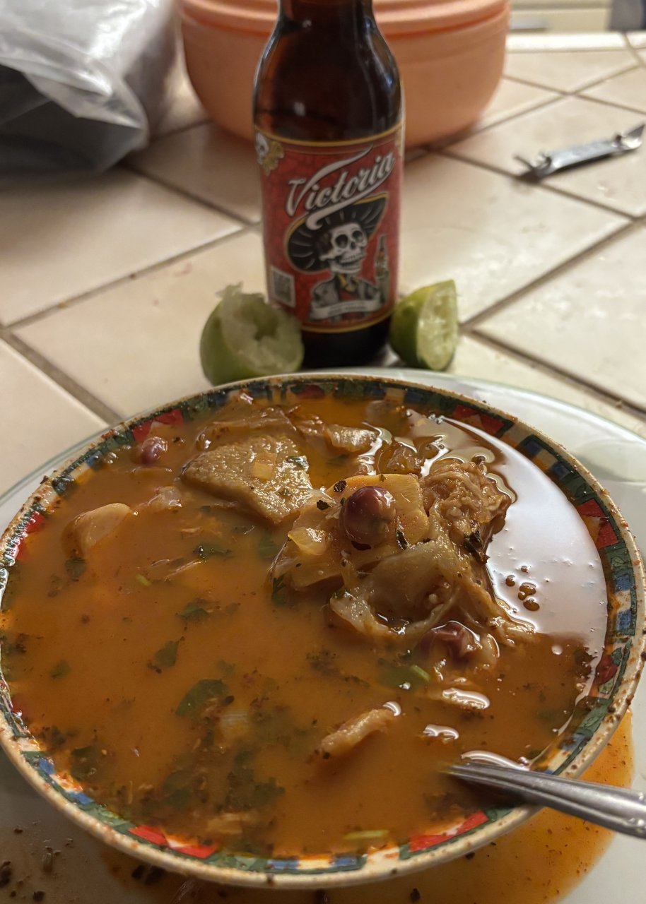 Late breakfast of champions. Menudo with “Pata”…. And an adult beverage.