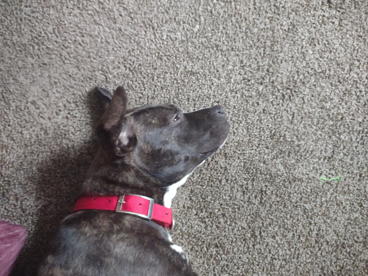 Nice Dog!! I had a brindle one like her. Daisy the Truckdriving Pit Bull. Have watch them, especially as pups. Like to follow their nose. Smartest Dog I ever had. I had a few acres at the time. She chased a rabbit out into the road. My fault, thought I had her trained.