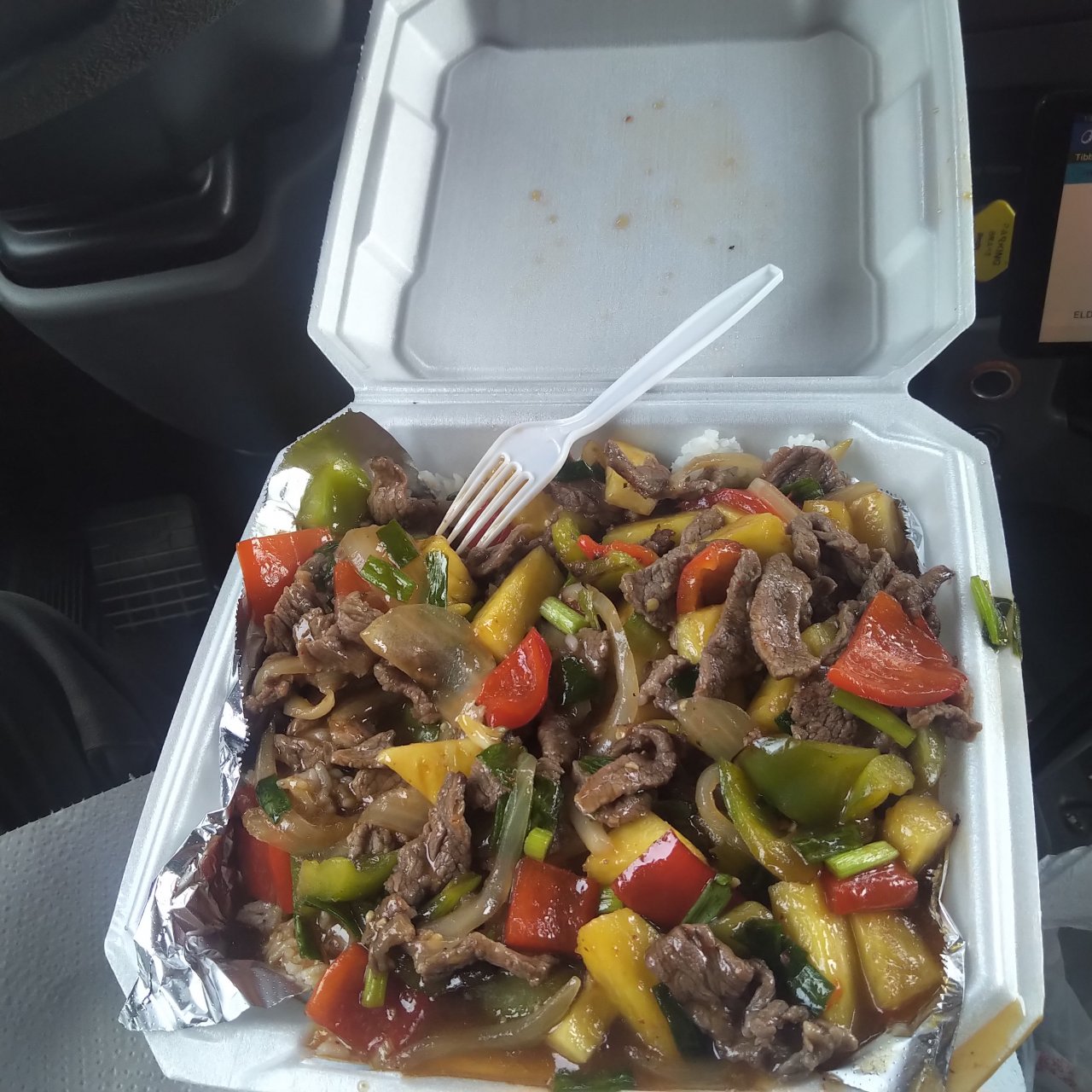 This is sweet and sour beef... but can get pork chicken or shrimp as well.. . . Pineapple, bell peppers, and onions. , white rice and sauce underneath all of it, pick how spicy you want it.... Everything is cooked fresh when u order.. 11 dollars and is easily 2 meals... most of their dishes are 8-9 dollars.... Also a mexican and bbq food trucks next door. If thai isnt your thing.