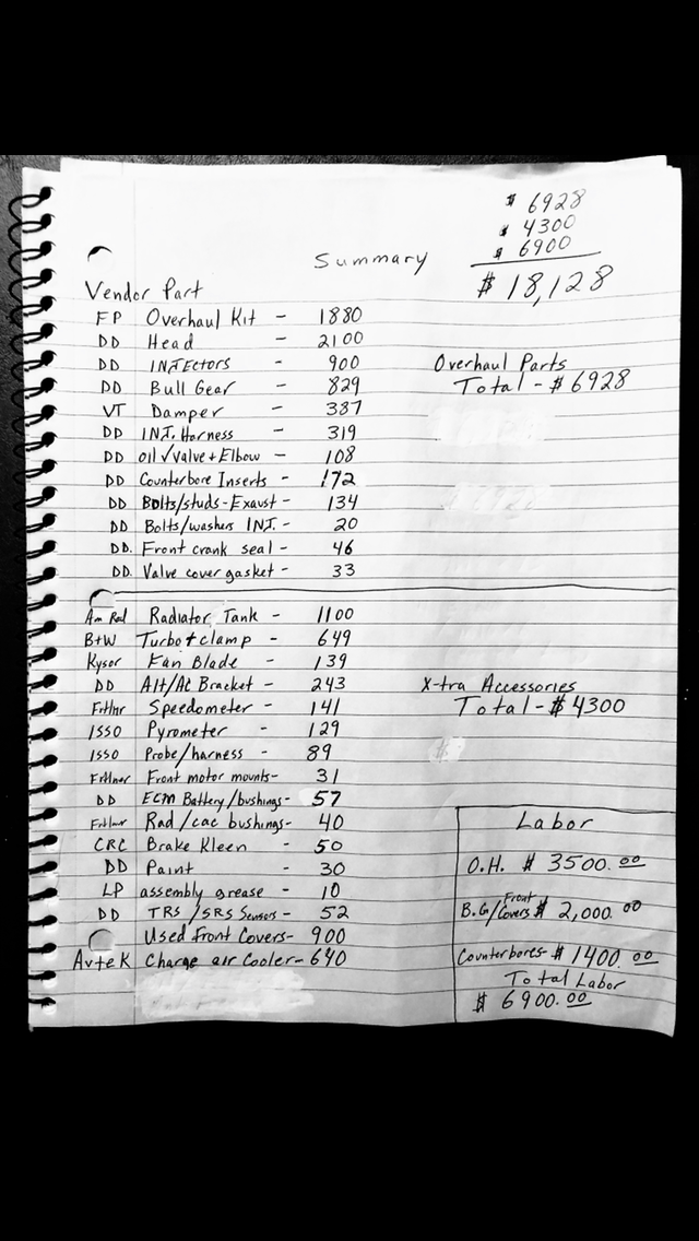 Here’s the breakdown of my recent OH. Only thing missing from a DD 3 yr. 300k warrantied OH is rebuilt rocker assemblies. I may do it yet, cost is $2000 for parts. Mine was good.My Last Truck had the 3 yr OH at Freightliner for $23k. in 2008. It include the rockers, I paid extra for new oil pump and jake rebuild kits. Later found out they didn’t change the camshaft bearings. What a waste of money. I’m very confident in this build. The counterbores were cut by an engineer at the Detroit factory, here in town, with 20 yrs experience cutting blocks. I watched the process. The Guy is sharp as a whip. 7 yrs experience at DD dealership, before college, then a few yrs with Roush, now 8 yrs at Detroit. He works on the emissions systems, testing and suggesting software upgrades. Says they finally got most bugs worked out in 2017. He even gave me a $400 friends and family discount. Unlike many claim, all cylinder protrusions being set at max .05 above the deck. He said no, ( the spec is .01-.05, with no more than .02 difference between adjoining cylinders) he set them all at .04” above the deck. The closer they are, the less chance of a blown head gasket. My last Truck blew a gasket at just over 500k. Just out of warranty. Warped the head. It happens. DD Rep bought the parts,$1800 at the time. I paid $1700 Labor. I had to make a lot of noise, told them I was going to dish DD on the CB everyday up and down I-94 from Detroit to Chicago. Lol.Speed_Drums, Dale thompson, Pamela1990 and 7 others Thank this.