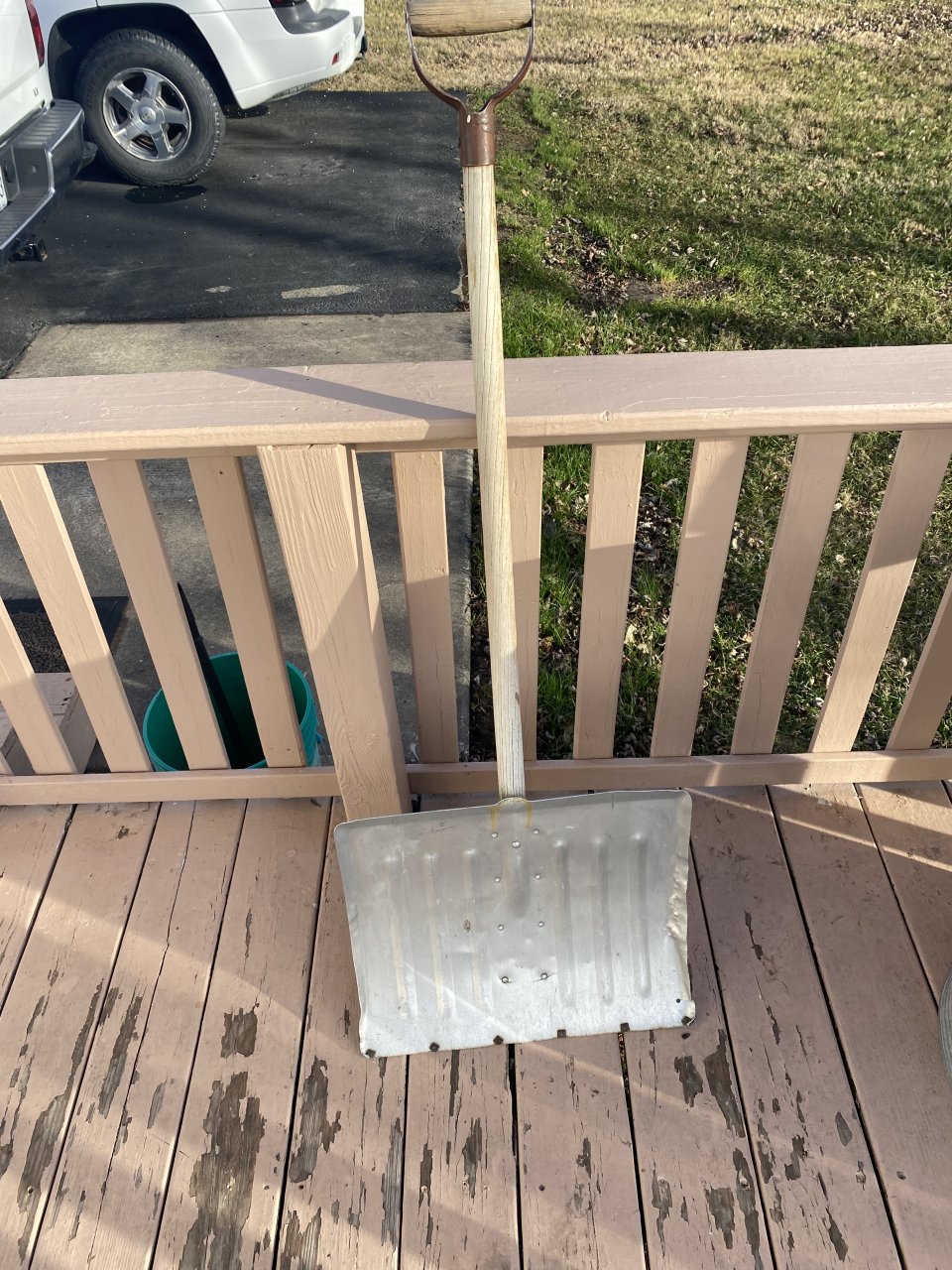 The snow had started to melt from the roof the night before and dropped water on the shovel handle which led to some ice on the handle.