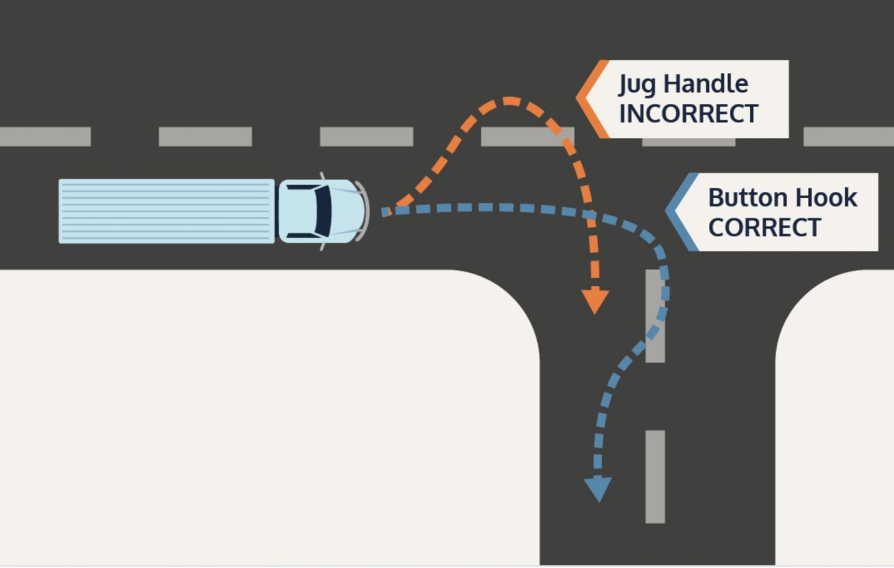 Button hooks the truck takes the lane to the left before entering intersection.