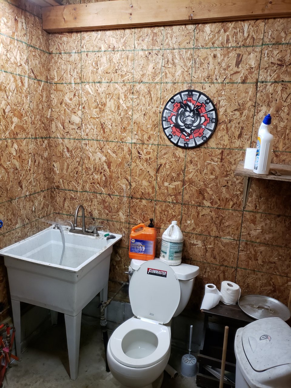 Regular plywood on the wall. It just looks prettier, and an elongated bowl toilet for reasons I won’t mention. -