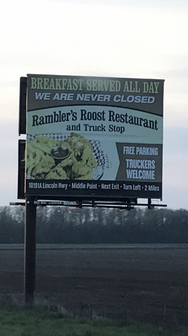 Set the brakes at Ramblers Roost in Middle Point, Ohio. Time to throw some groceries down my neck....