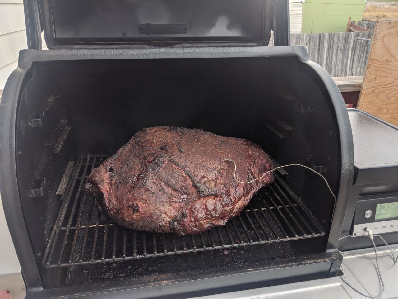This thing is about 22 pounds. I think they'd have been better off with half a dozen briskets rather than a roast that's this big but I ain't the one who got sent to the store. I hope it turns out good anyway. Got it smoking at 165 degrees on hickory pellets. Probably cover it in foil tonight and crank it up to 225 til it's done.