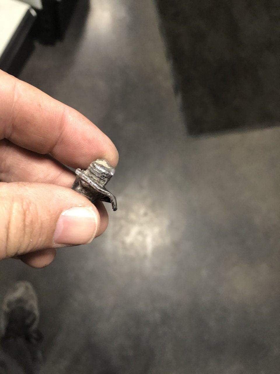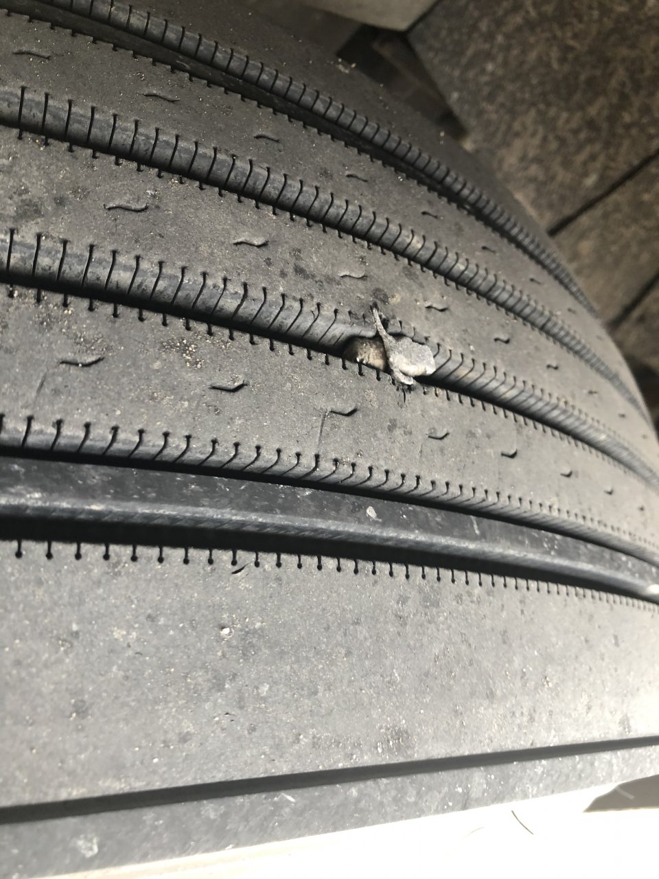 Made a racket when what ever was in it came out. I was 65 on the freeway and drove for maybe 3/4 of a mile before I decided to stop to see what the noise was. Couldn’t tell I even had a flat. Had to get out and look before I knew what really happened. Tire stayed together but was off the bead and filed with a little rubber dust. The next day I found this in the other steer but it didn’t penetrate. I really had to dig to get it out though.