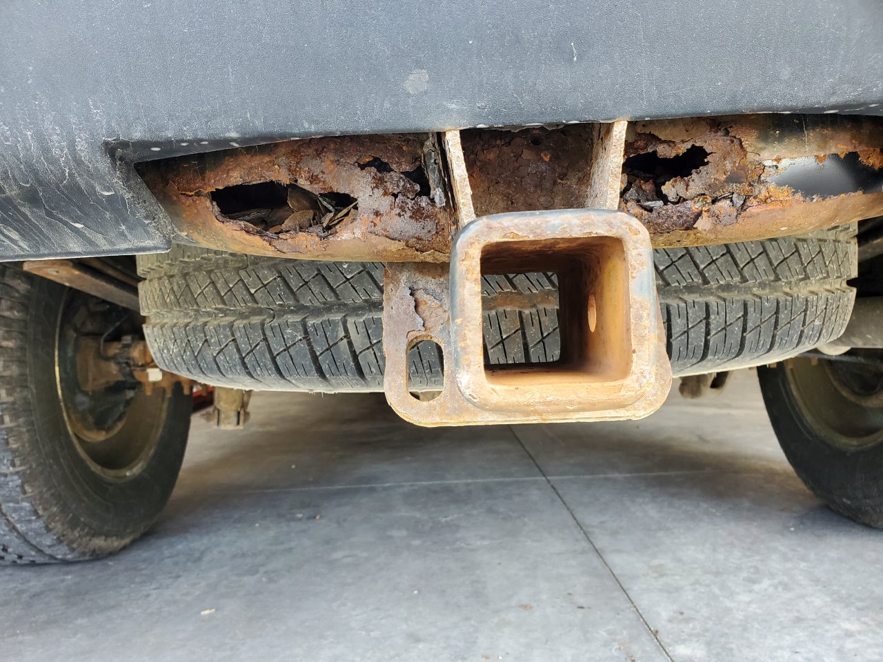 20200425_121729.jpg Aw, hell, slammed my tailgate shut on my 08 Chevy and a pile of rust fell to the ground ! ...looks like I ain't pulling my mower trailer with this till I fix it !.... @1951 ford ......got a job for ya !