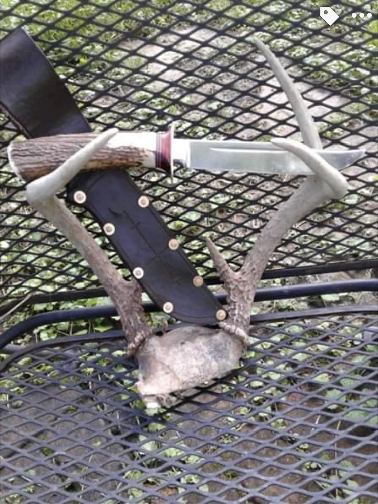 1095 carbon steel fitted with elk horn and brass finger guard. Rivets in sheath are 10 Gauge copper wire with brass washers in each side......