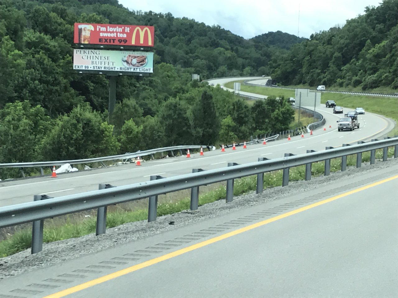 This cat wiped out the guard rail on the right side in a right hand turn.... but it is a dog leg coming down hill. He layed it over on by the billboard.