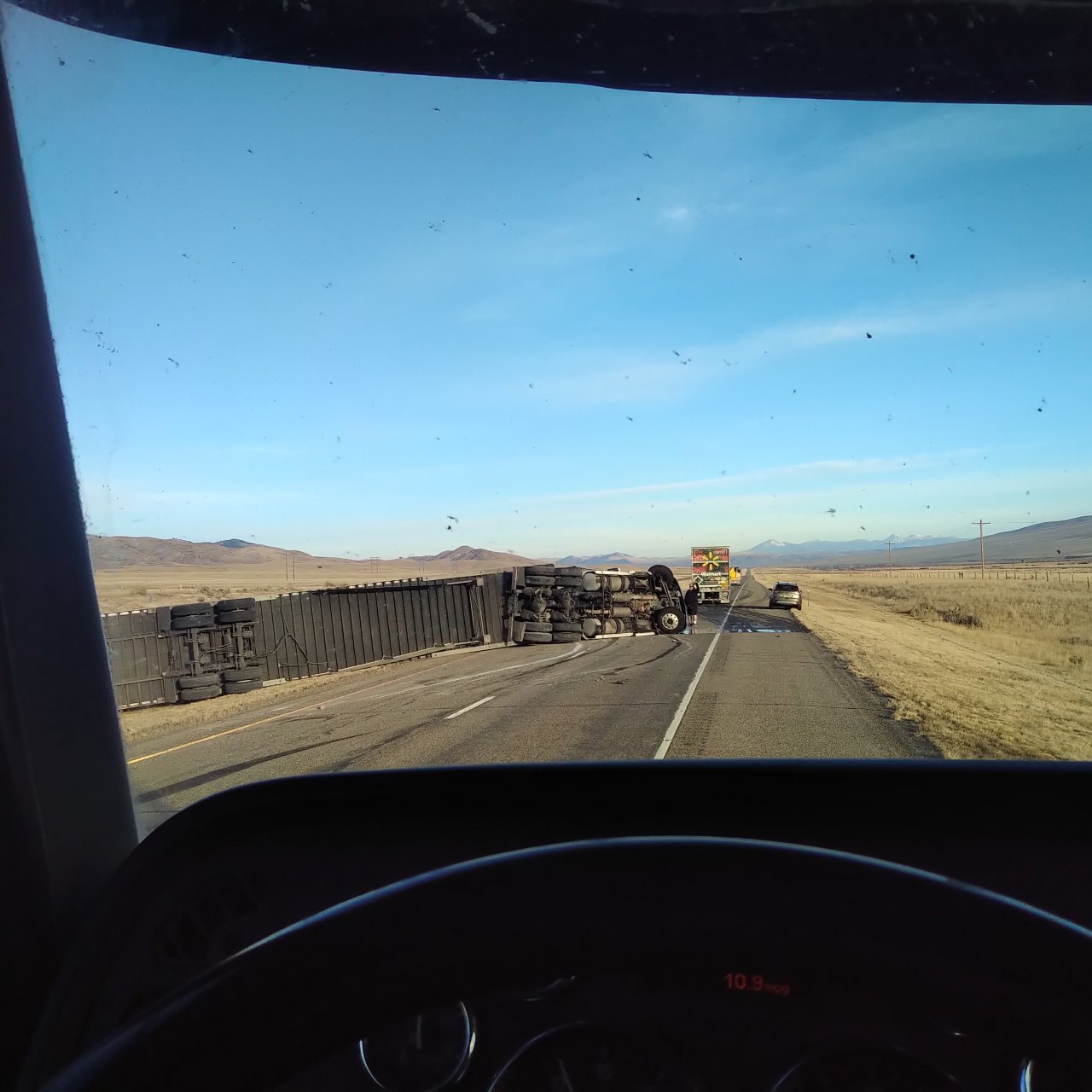 Grain hauler pullin doubles, rolled up in the ditch this mornin. Blockin both northbound lanes , i15 montana. Nice sunny day , about 40 degrees. Think he nodded off and hit the median , tried to save it and over he went. Unfortunate.