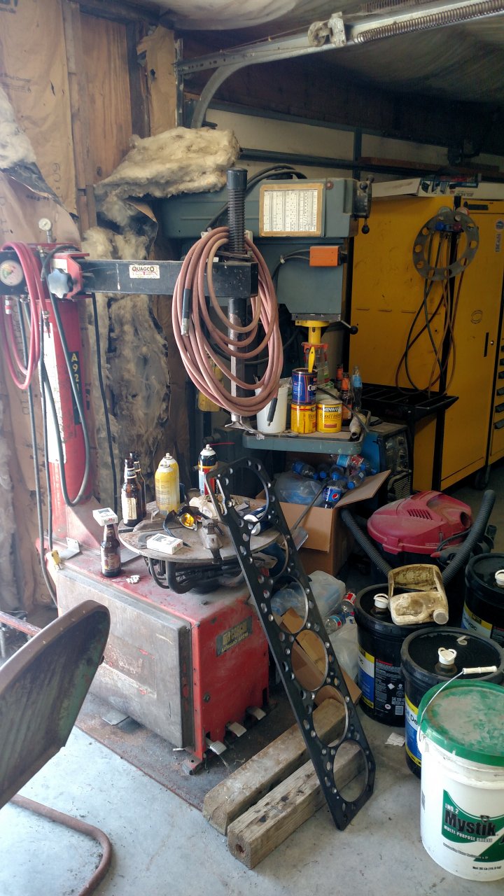 The welder is connected to the...drill press. The drill press is connected to the...tire mounting machine. The tire machine is connected to the ...head gasket, and that is Hurricane’s garage.