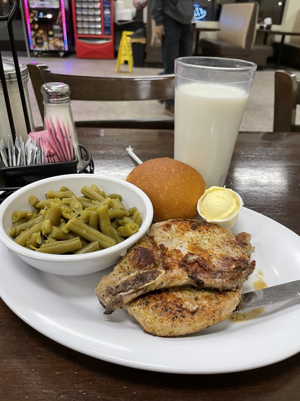 Pork chops green beans AND milk. Nellie’s restaurant in Cameron Missouri