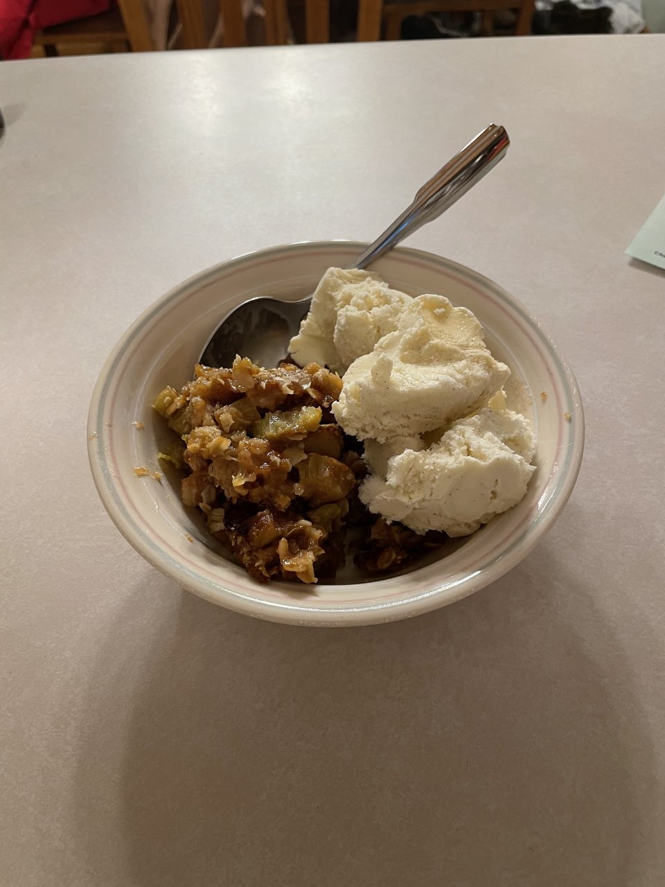Fresh rhubarb crisp and ice cream for dessert.
