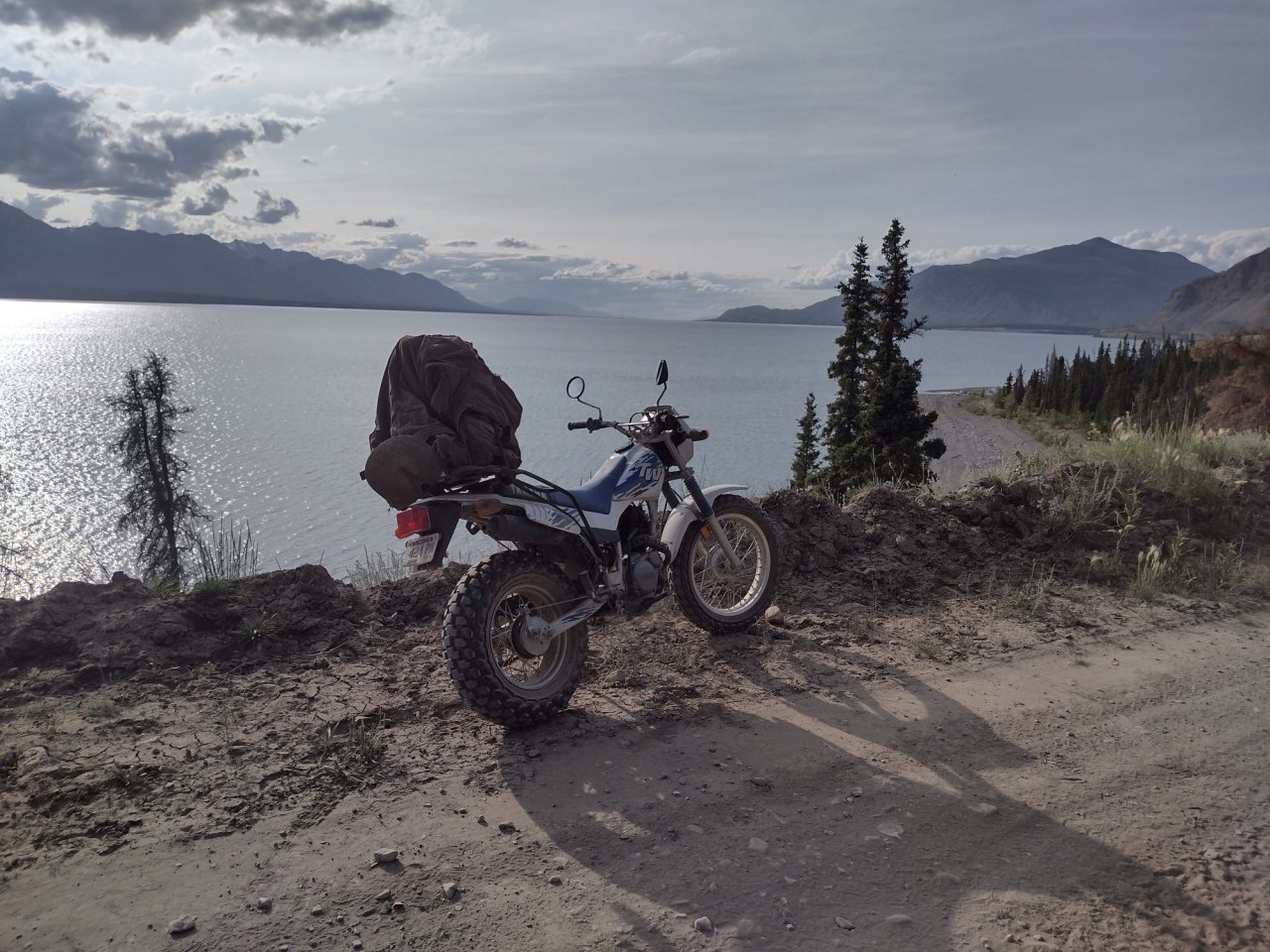 28 miles back in the mountains on the north side of Kluane Lake. (Western Yukon) digging for gold. The Alaska highway runs along the edge of the lake on the left side of the picture.