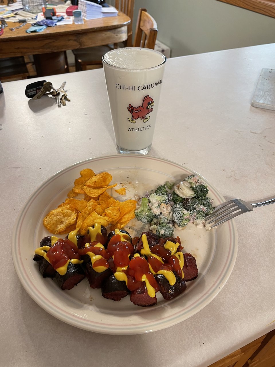 Current situation. Cut up hotdogs with broccoli salad and some bbq chips. And milk.