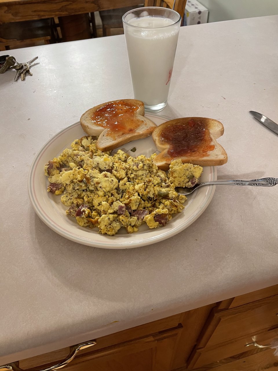 0448782D-E802-4DD8-89E9-89C8E6B97324.jpeg Breakfast for supper. Scrambled eggs with cut up hotdogs, shredded cheese, and a few jalapeños.