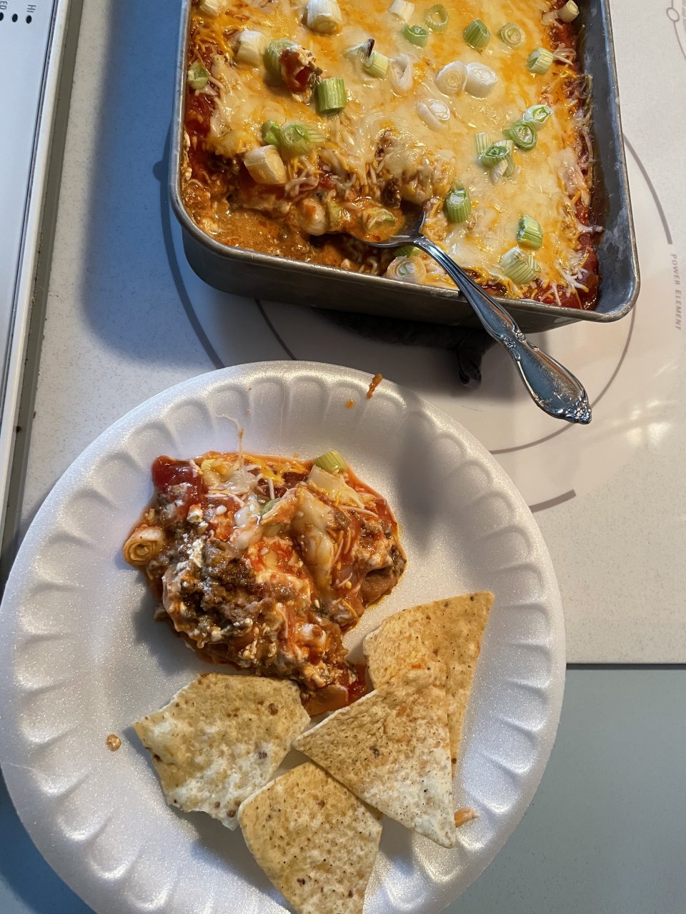 Beef, beans, sour cream, some kind of Mexican salsa mix stuff, 3 different cheeses, and green onions…..