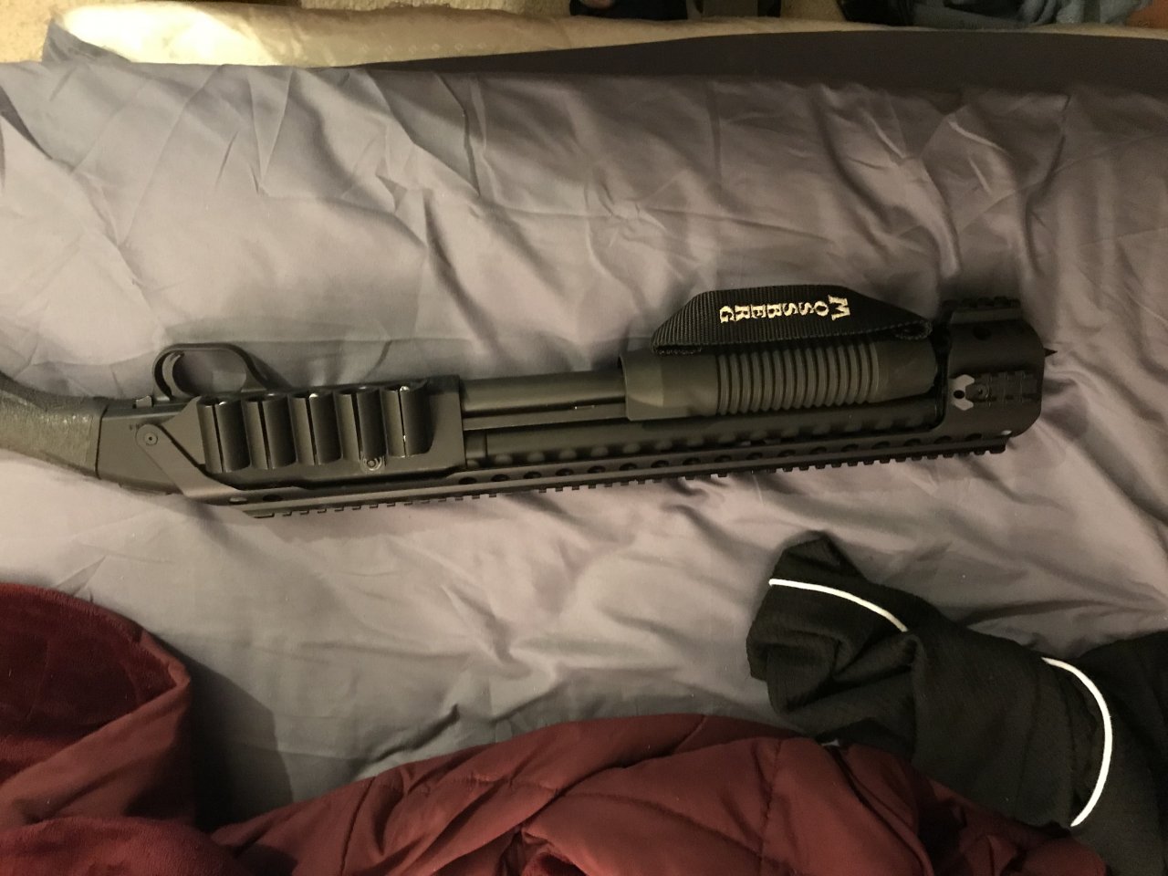 This one had that same small sling grip on the pump, it was similar to yours minus the top rail. $419 and it had the shortest barrel I had ever seen, I was wondering if it could even hold 5 shells at first. I have an 870 Express unmolested and a Turkey Express 3.5 inch. By the time you pay $260 for another one and convert it to tactical, $419 is a very good price. Sharp looking gun, Six.